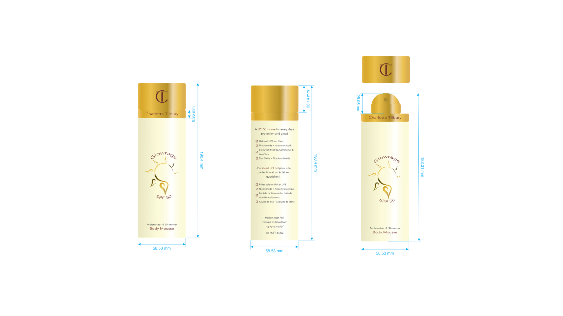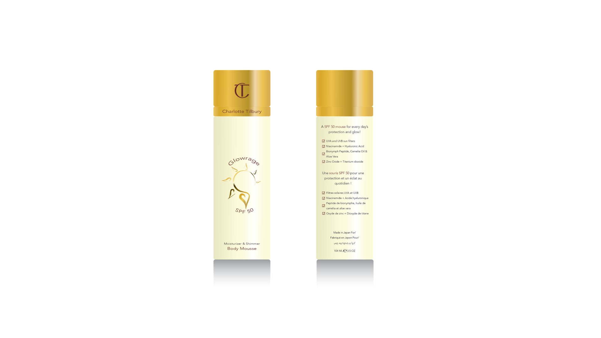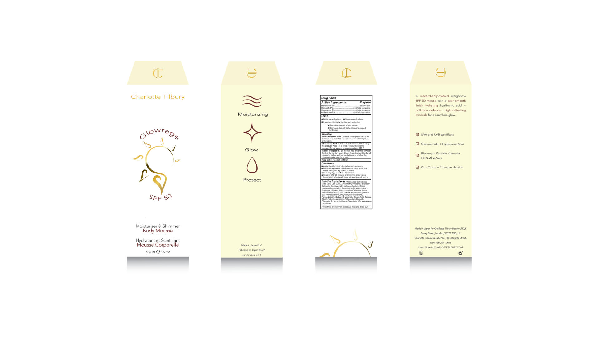 Charlotte Tilbury - Packaging and Branding DesignInspired by my all-time favorite beauty brand, Charlotte Tilbury, I decided to enhance and refine my branding skills by designing a hypothetical look for Charlotte Tilbury’s primary and secondary packaging. Adobe Illustrator and Dimensions being my medium that facilitated the creation of the hypothetical new product the brand would launch, The Glowrage Body Mousse. Overall, through this project duration, I conducted in-depth brand, competition, and industry research. To then identify their Charlotte Tilbury brand identity so I can finally start the ideation process and innovate a new, engaging packaging design.